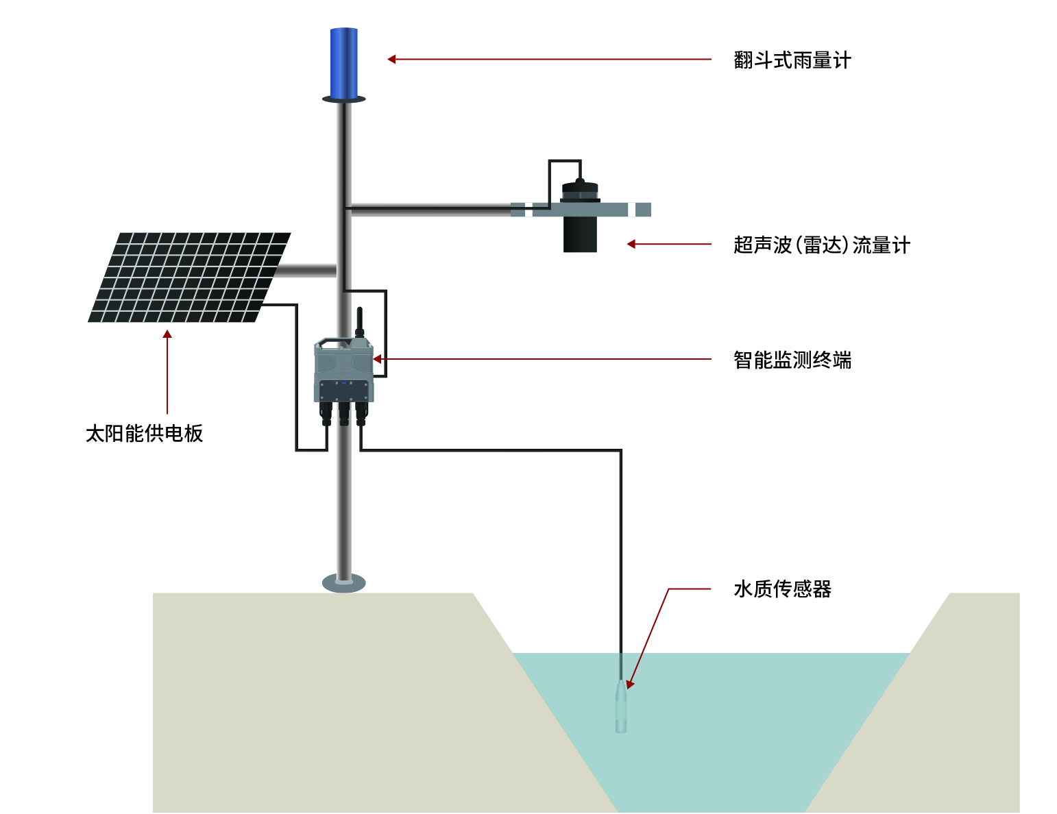監(jiān)測(cè)河道內(nèi)液位、流量數(shù)據(jù),當(dāng)水位即將超過(guò)河道警戒線時(shí)進(jìn)行預(yù)警。同時(shí)還可安裝水質(zhì)傳感器,當(dāng)PH值、濁度等數(shù)據(jù)超過(guò)正常值時(shí)上報(bào)至相關(guān)部門監(jiān)測(cè)中心,監(jiān)測(cè)水質(zhì),保護(hù)河道水環(huán)境、為偷排漏排監(jiān)管提供數(shù)據(jù)依據(jù)。